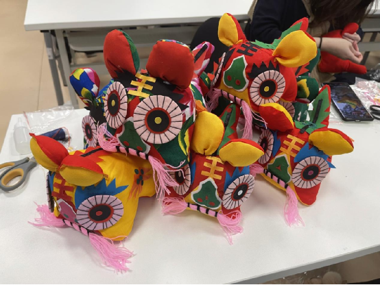 活動現(xiàn)場,大家通過視頻學習了布老虎的縫制方法與技巧,紛紛按照要求操作起來,大家把布袋剪開,往里塞棉花,布老虎的頭和身體就成形了。然后用膠水粘上眉毛、眼睛、鼻子、胡須,布老虎已顯出神采?,F(xiàn)場的每個人都做得非常認真,一針一線都經(jīng)過自己的反復斟酌,從一開始的小心翼翼到熟能生巧,一邊討論、交流各自的手工心得,一邊互相幫助,短短一個小時就制作出了一個個生動活潑、造型各異的布老虎,在愉悅的節(jié)日氛圍里,每個人都收獲了自己親手制作的布藝品。
