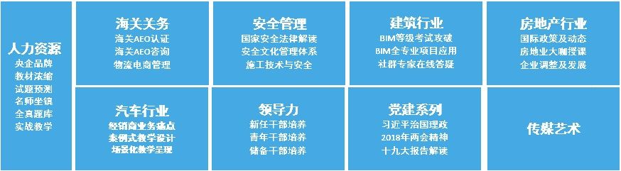 ??? 中智大學(xué)堂發(fā)揮資源優(yōu)勢與多年的行業(yè)經(jīng)驗(yàn),在黨建、領(lǐng)導(dǎo)力、人力資源、海關(guān)關(guān)務(wù)、安全管理、傳媒藝術(shù)、建筑行業(yè)、房地產(chǎn)行業(yè)、汽車行業(yè)等領(lǐng)域開發(fā)出了系列爆款產(chǎn)品,打造全場景覆蓋,混合型學(xué)習(xí)和管理,行業(yè)級(jí)培訓(xùn)解決方案。